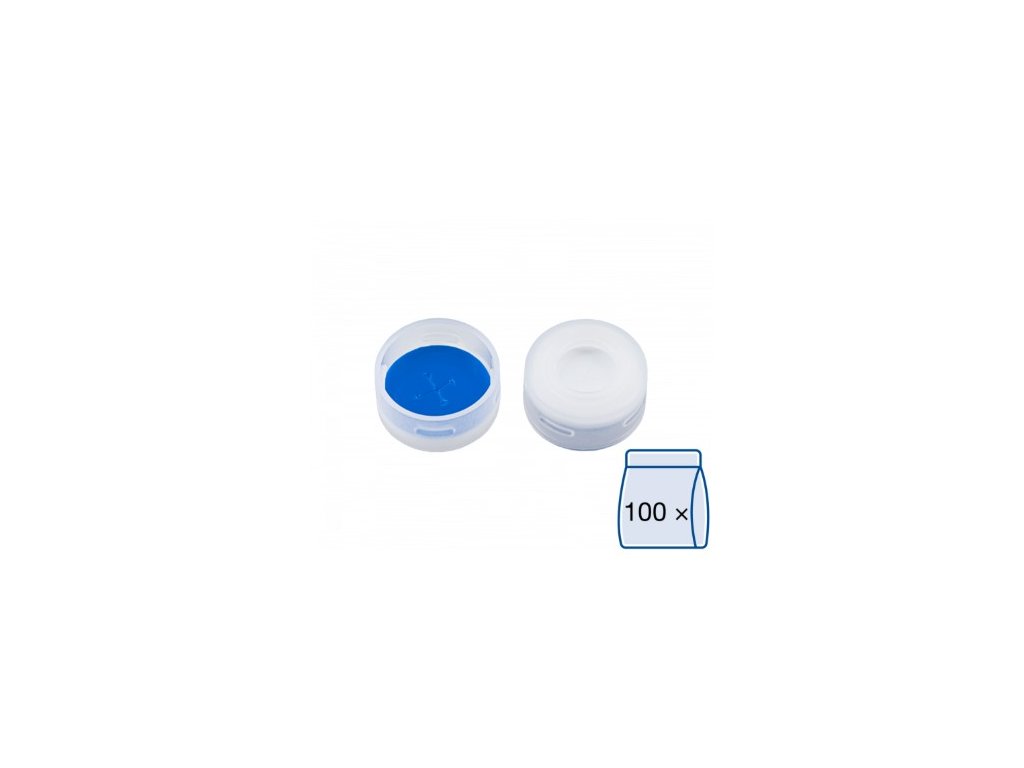 Uzáver N 11 PE snap cap, transparent, center hole, Silicone white/PTFE blue, cross-slit, 1.0 mm, 100ks, 702064