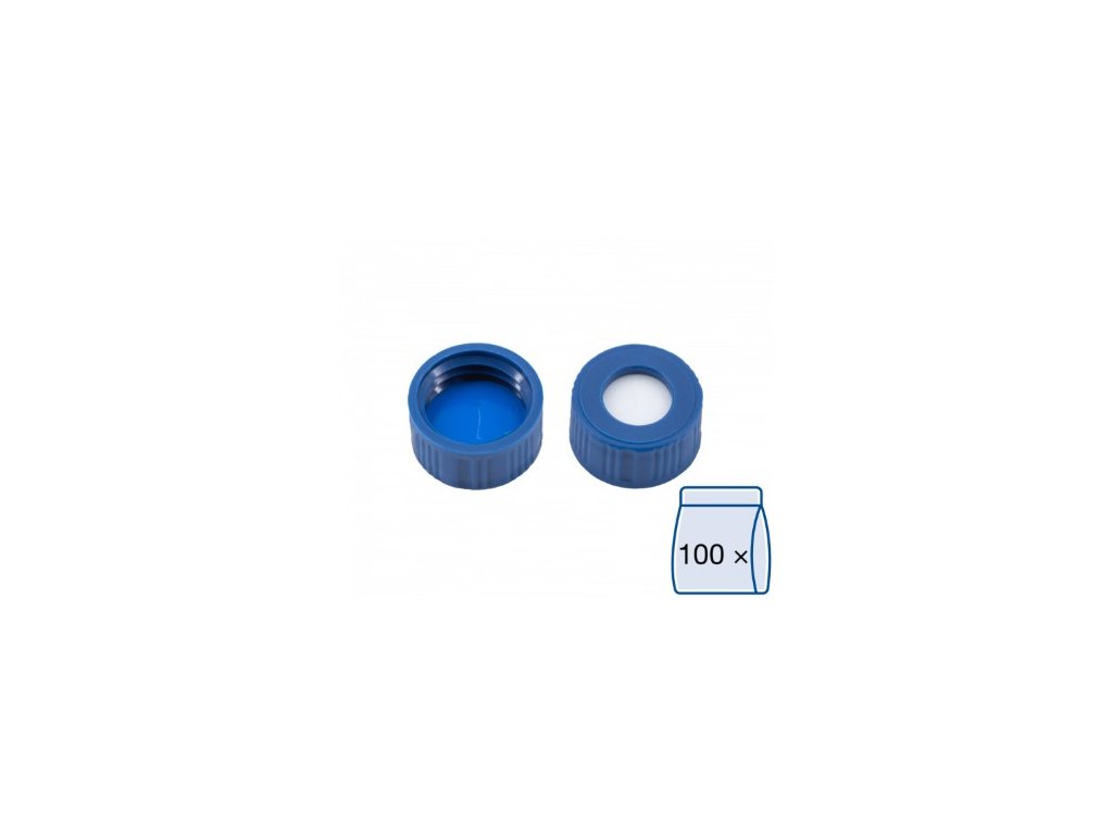 Uzáver N 9 PP screw cap, blue, center hole, Silicone white/PTFE blue, slit, 1.0 mm, 100ks, 702288.1